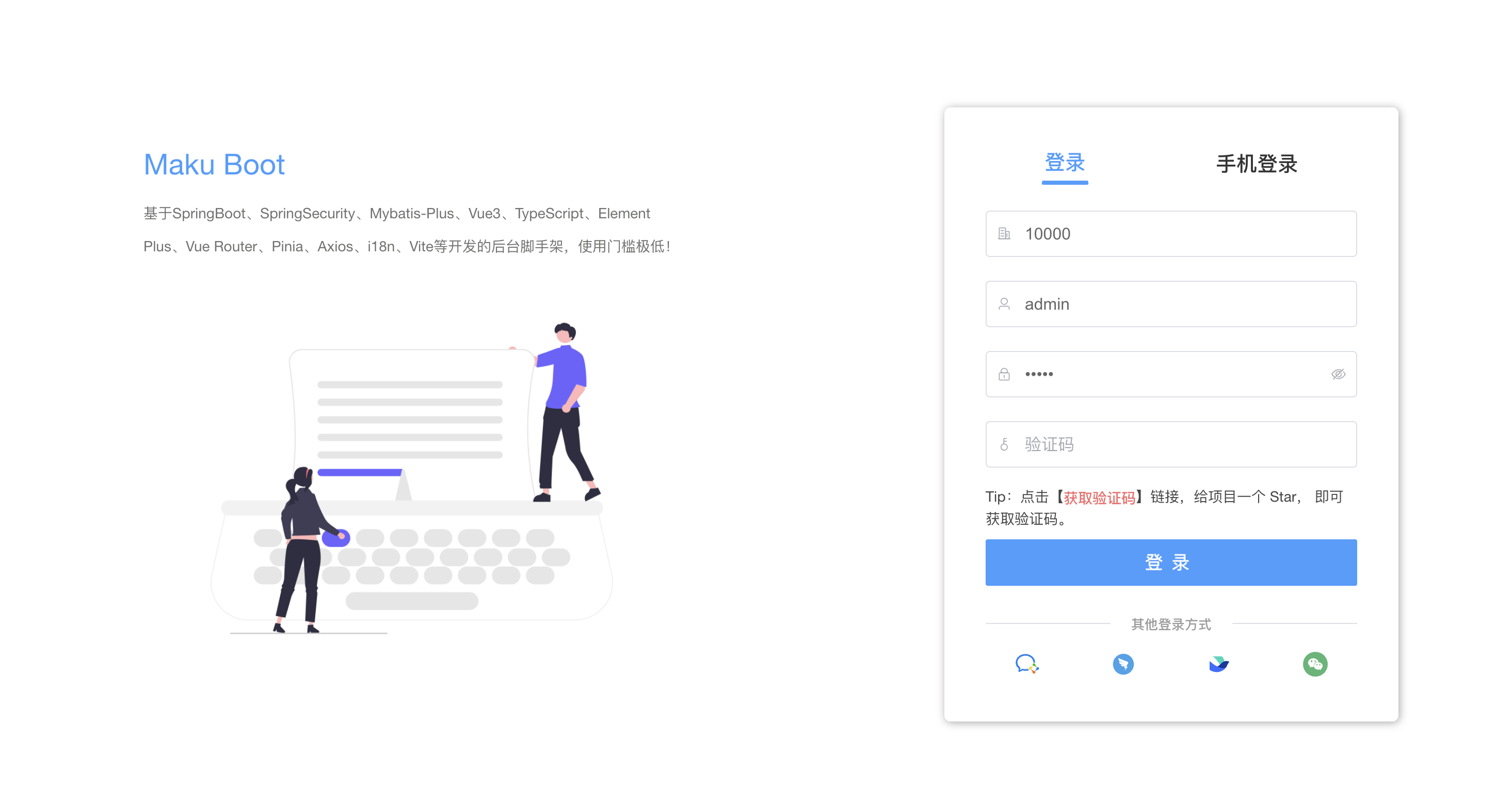 • maku-boot 是采用SpringBoot3.3、SpringSecurity6.3、Mybatis-Plus、Flowable7.0、Vue3、Element-plus等技术开发的低代码开发平台旨在为开发者提供一个简洁、高效、可扩展的低代码开发平台。