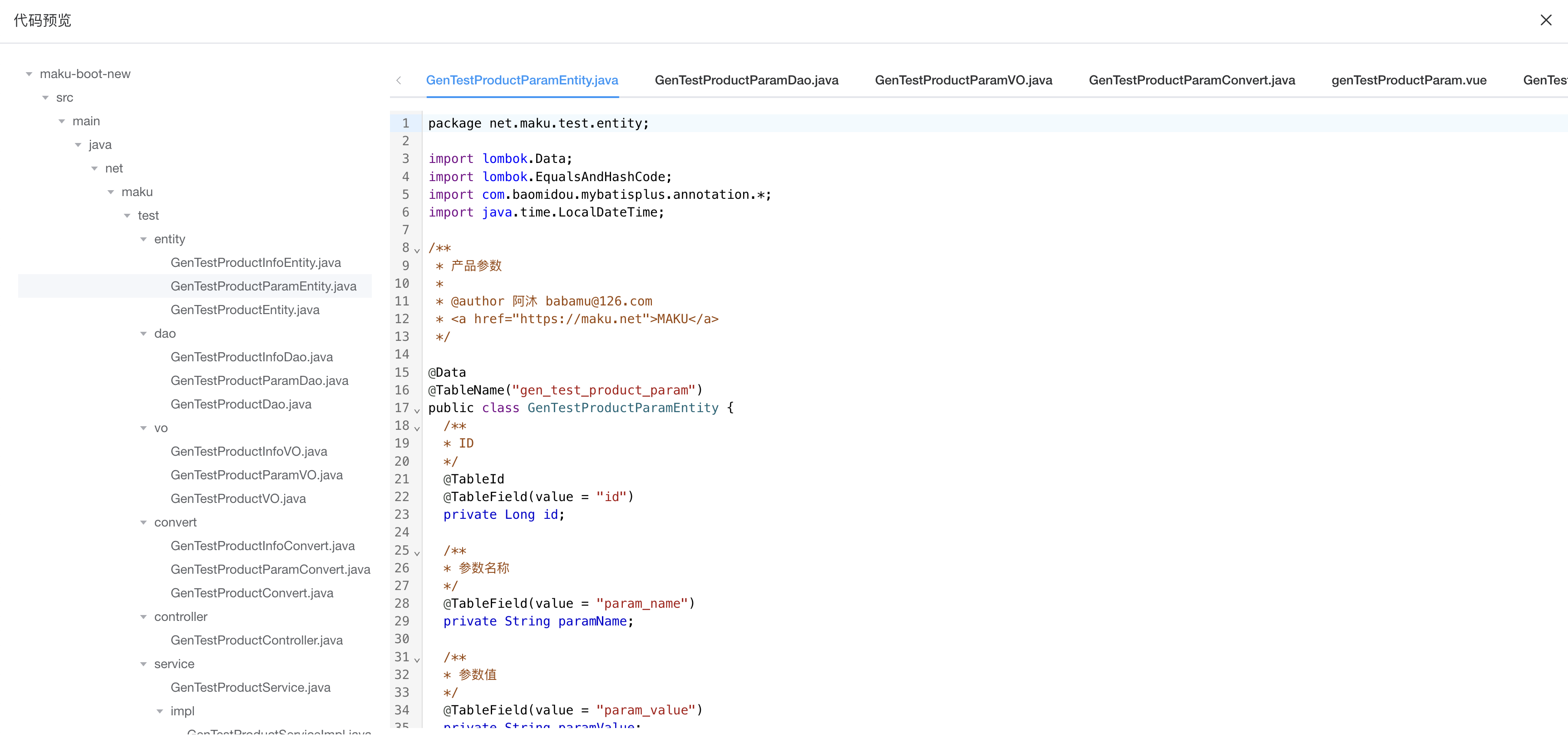 • 支持代码生成功能,可以生成单表、树表、多表等业务代码,开发更快速。