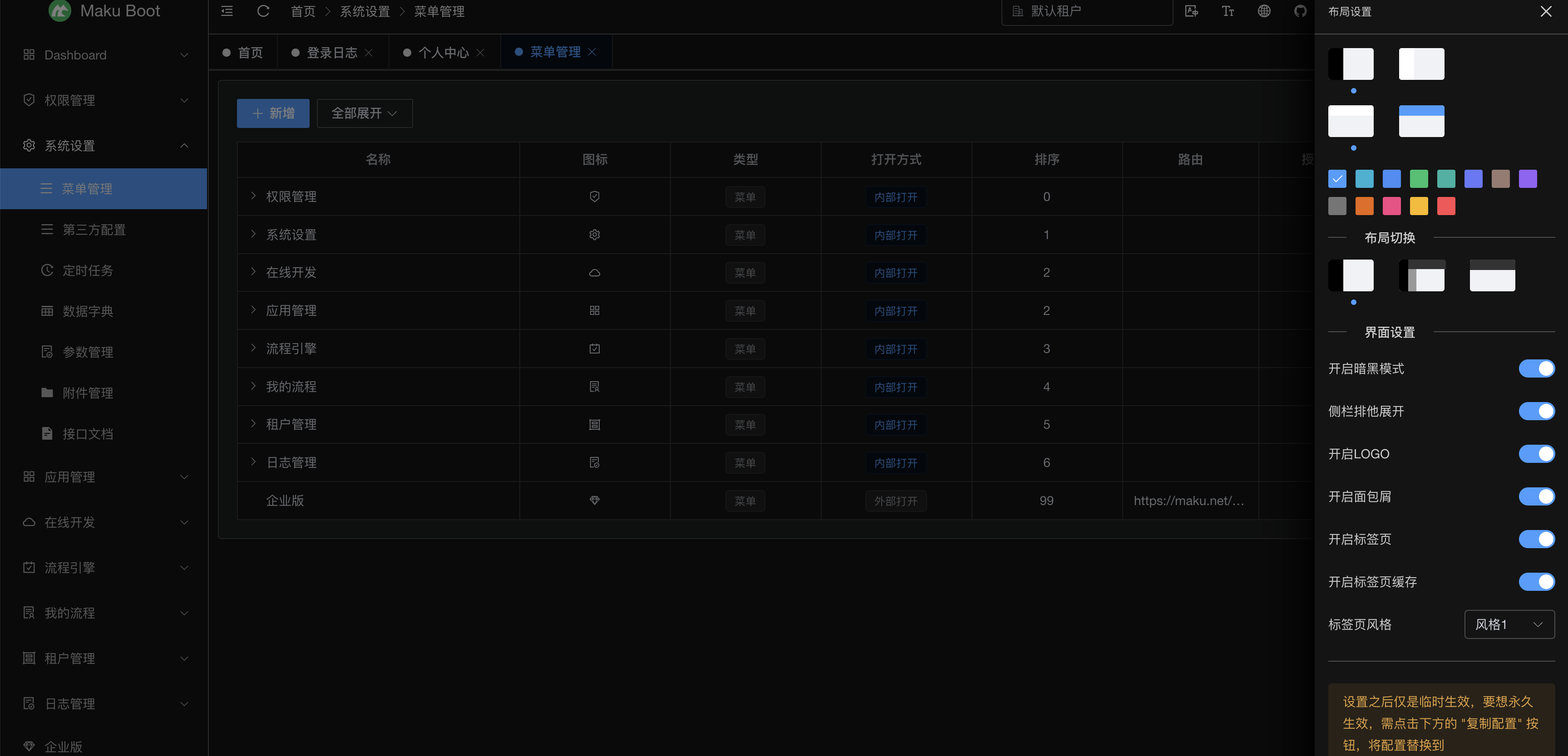 maku-boot 是采用SpringBoot3.3、SpringSecurity6.3、Mybatis-Plus、Flowable7.0、Vue3、Element-plus等技术开发的低代码开发平台,旨在为开发者提供一个简洁、高效、可扩展的低代码开发平台。